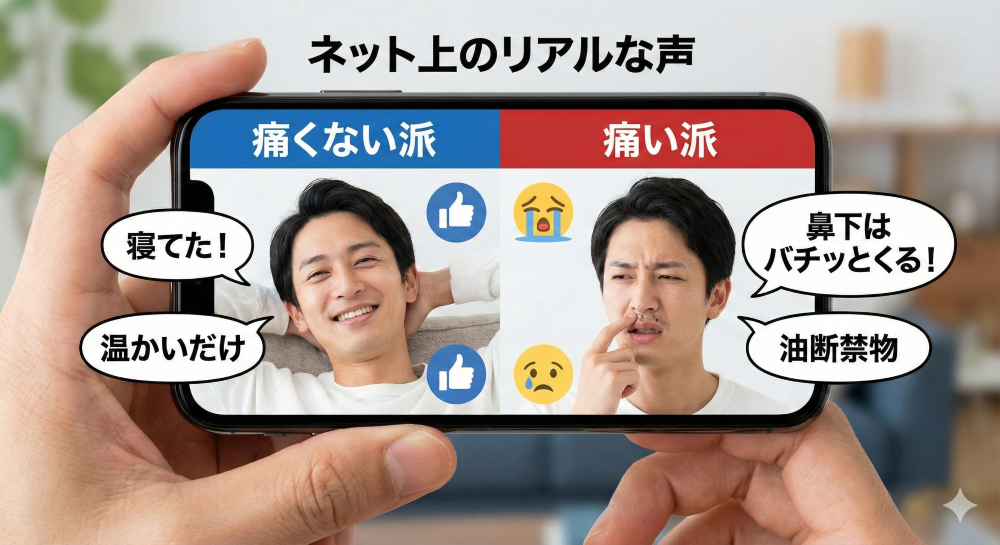 私個人としては「鼻下ともみあげはバチッと痛い」という感想ですが、他の利用者はどう感じているのでしょうか? ネット上の口コミやSNSでの評判をリサーチしてみると、やはり私と同じような「痛みのギャップ」を感じている人が多いようです。